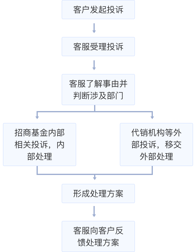 (一)基金投資人可以通過撥打我公司客戶服務電話或以在線咨詢(官網(wǎng)、微信、APP)、電子郵件、傳真、書信等方式,對我公司所提供的服務提出建議或投訴。我公司在接收投訴3日內(nèi),作出是否受理的決定。我公司受理的投訴,自收到投訴之日起20日內(nèi)作出處理決定。情況復雜的,可以延長處理期限,但延長期限不得超過20日。